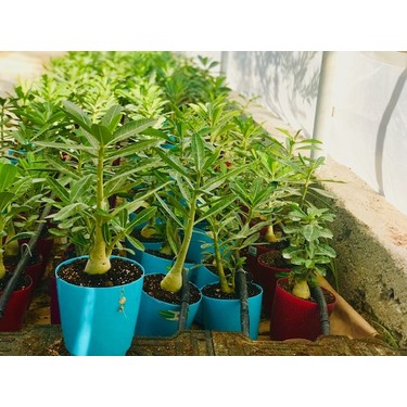 Adenium çöl gülü bonsai adenium çöl gülü çiçeği fidanı 8 lik üretim saksısında ve boy 10 cm 15 cm tohumdan üretilmiş gerçek adenium bitkisidir.