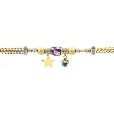 14 ayar altın bilezik. 14 ayar altın bileklik. 14 ayar renkli taşlı pandora altın bileklik. Bu sarı altın bileklik 14 ayar altından üretilmiştir gb43990 kar tanesi melek nal bileklik toplam ağırlığı yaklaşık olarak 5 36 gramdır.