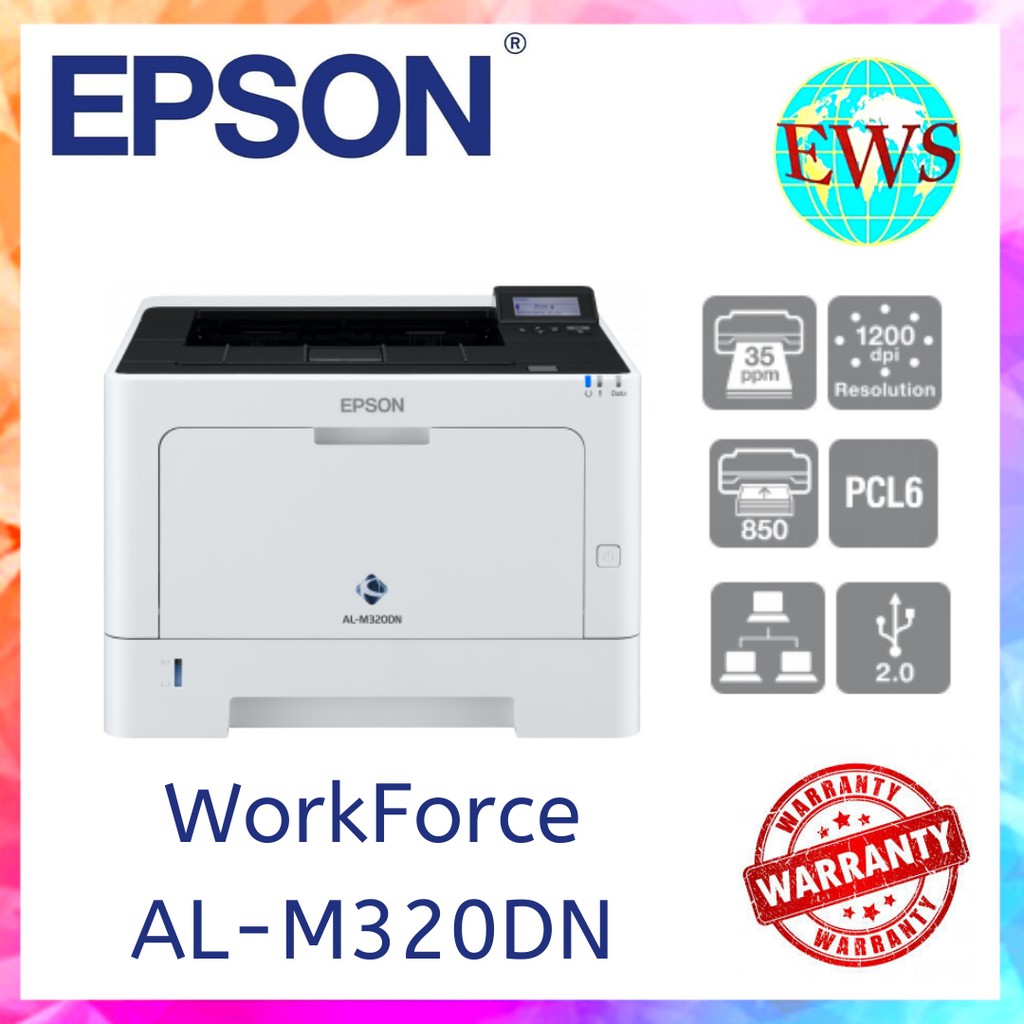 Epson workforce al m320dn mono laser printer. Reduce waiting time with first page out time of less than 6 4 seconds and fast printing speeds of up to 40ppm. The epson al m320dn is everything you need to run your office wrapped in a small device. 1200 x 1200 dpi kecepatan cetak hingga 35ppm auto duplex ethernet epson iprint.