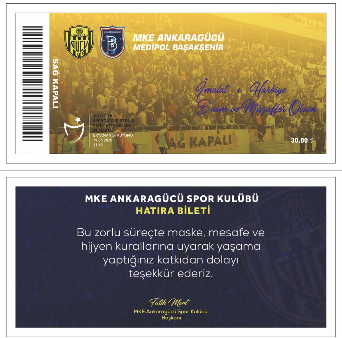 Mke ankaragücü kulübü koronavirüs salgını nedeniyle süper lig de seyircisiz oynanacak maçlar için hatıra bilet çıkardı.