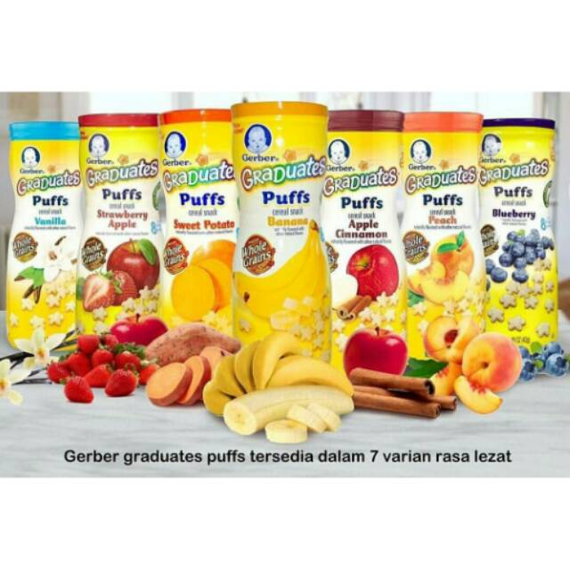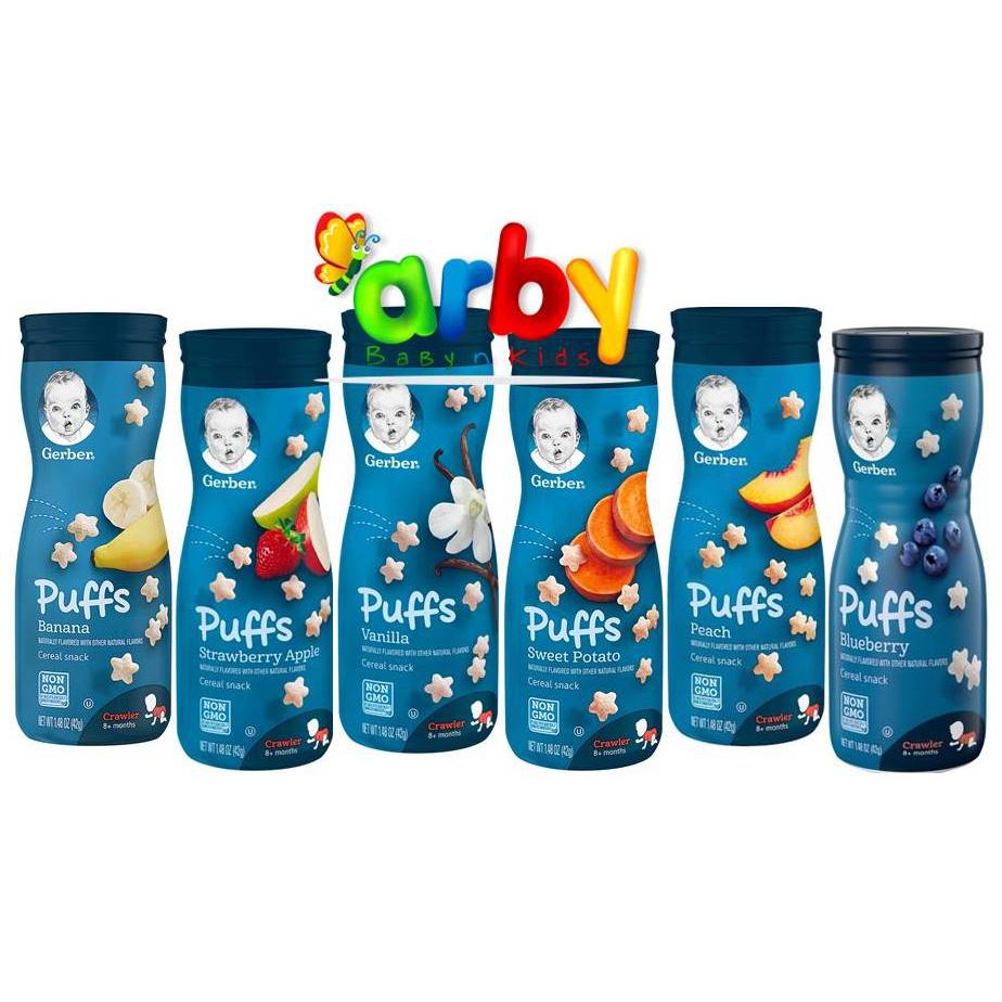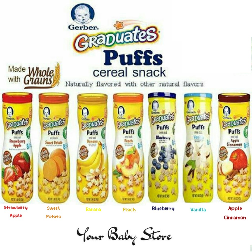 Gerber sweet potato grain 1 48z. Gerber graduates puffs cereal snack have 2 grams of whole grains per serving and 5 vitamins and minerals making them an ideal snack for your older baby learning to self feed. P make every little bite count with gerber organic puffs puffed grain snack. Buy gerber puffs cereal snack peach 42g online at the best price and get it delivered across uae.